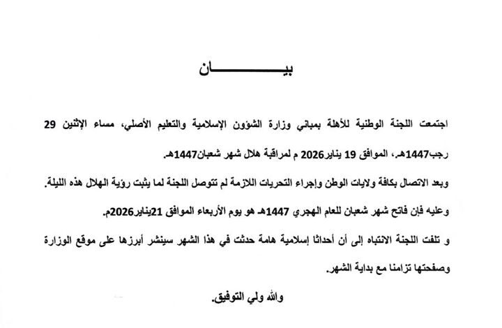 أعلنت اللجنة الوطنية للأهلة أن غدا الأربعاء الموافق 21 يناير 2026م هو فاتح شهر شعبان للعام الهجري 1447، وأن يوم غد الثلاثاء سيكون المكمل لشهر رجب من السنة الهجرية نفسها.