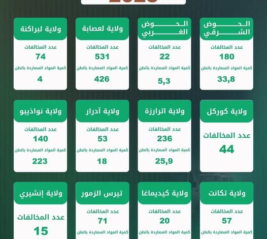 كما شملت الحملة ولايات الحوضين، حيث سُجلت 180 مخالفة في الحوض الشرقي، و22 مخالفة في الحوض الغربي، إضافة إلى ولايات نواكشوط (140)، كيدي ماغه (20)، وإنشيري (15)، مع مصادرة كميات مختلفة من المواد قدرت بعشرات الأطنان.