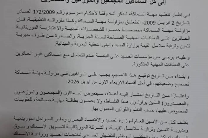 ونبهت إلى أن مزاولة مهنة السماكة مخصصة حصرا للشخصيات المادية والاعتبارية الموريتانية الحائزين على البطاقات المهنية الصالحة للسنة الجارية، والصادرة عن مديرية تثمين وترقية سلاسل القيمة بوزارة الصيد والبنى التحتية البحرية والمينائية.