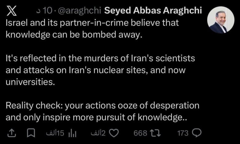 وزير الخارجية الإيراني حول العدوان الصهيوني الأمريكي على الجامعات: إن أفعالكم اليائسة لا تزيد إلا من الدوافع العلمية.