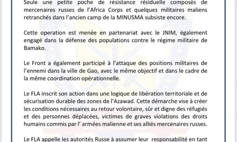 التأكيد على سيطرتهم الكاملة على مدينة كيدال وذكر البيان ان المدينة لم يبقي فيها إلا من وصفهم بمرتزقة الروس وبعض قوات الفيلق الأفريقي.